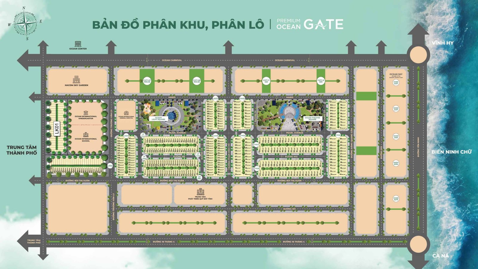 - Ocean Townhouse – 188 căn tọa lạc tại trung tâm khu đô thị với không gian công viên xanh rộng lớn, đài phun nước tráng lệ cùng hệ tiện ích về trường học, y tế đa tiện ích là sự kết hợp hoàn hảo giữa an cư nghỉ dưỡng với hoạt động kinh doanh hứa hẹn trở thành khu mua sắm, con đường thời trang, văn phòng sầm uất và tiện nghi.